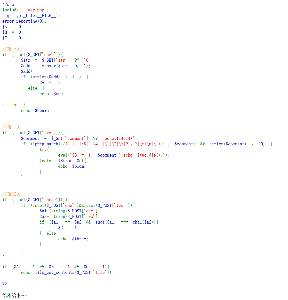 1 | eval('$B = 1;'./*.';echo $two;die();'); |