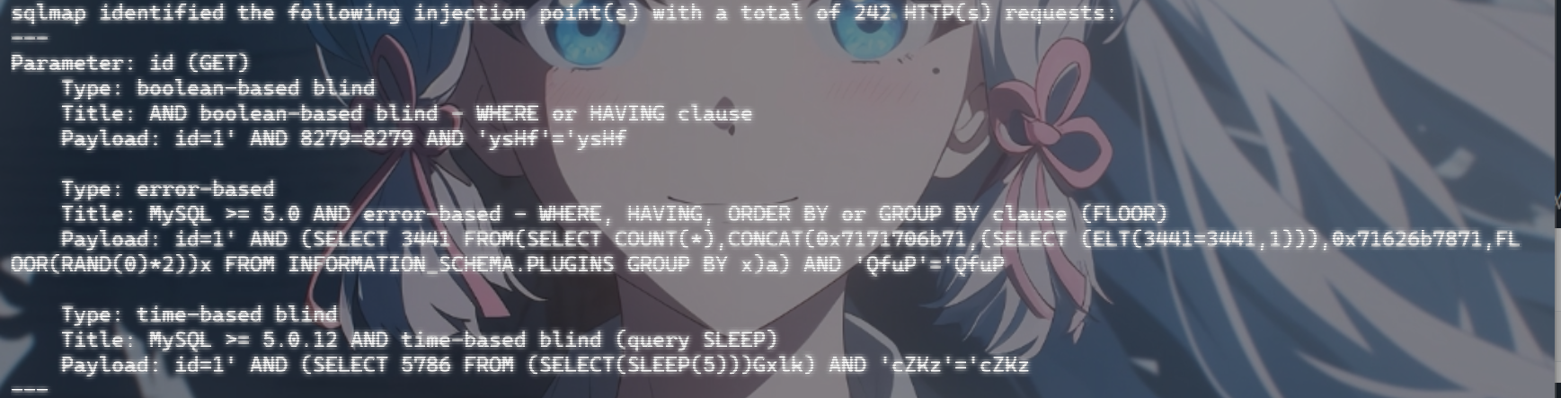 1 | ?id=1' and ascii(substr((select database()),1,1))=115 --+ |